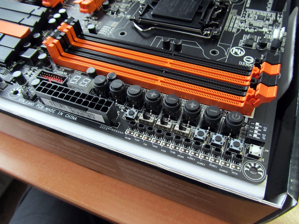 4DIMM的記憶體插槽下方有超多的按鈕以及電壓測量點,提供給高階超頻玩家使用。